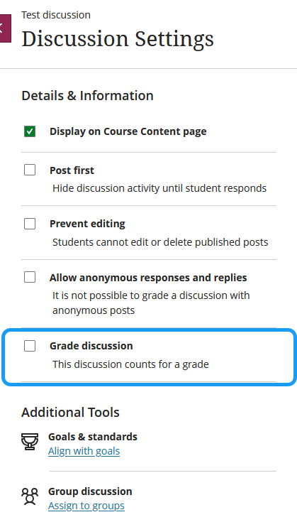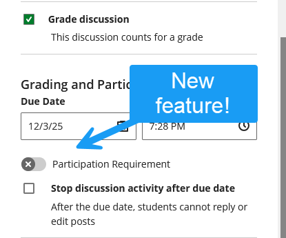 The first one is an additional setting in graded discussion that might be of interest for those of you using discussion boards. To access this new feature, you need to first make sure that the discussion is graded (or change that setting as below):