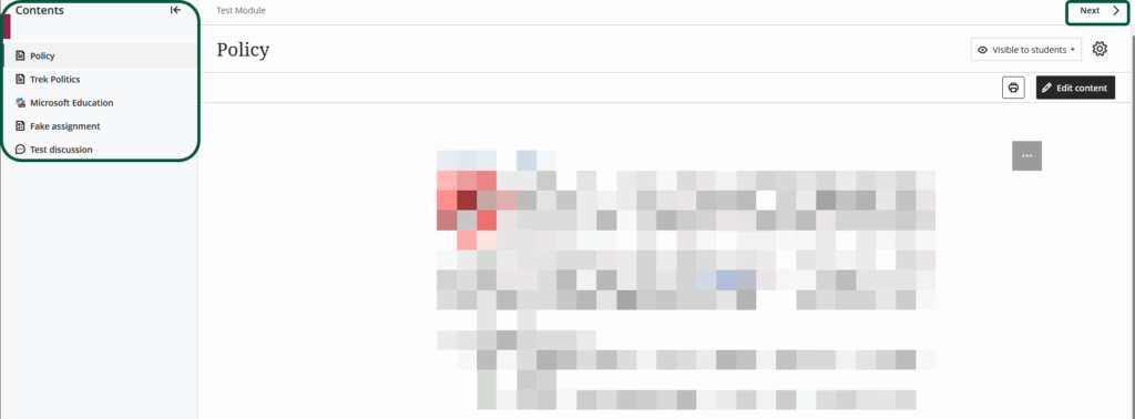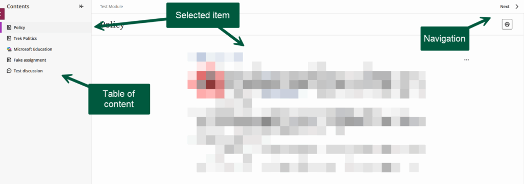 Once they click on one of the items, that item will open, along with a module TOC and navigation options so they don’t have to come back to the main content page to work their way through the module.
