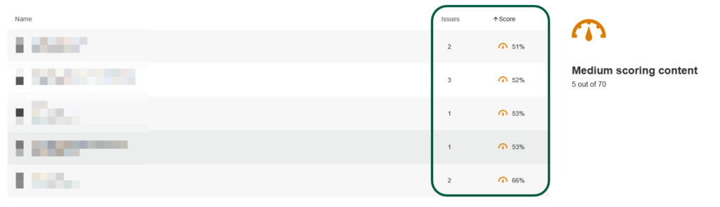 As with the low scoring issues, clicking on the dial circled above takes me to a more specific list of which content items I will need to fix, and how many issues each item has.