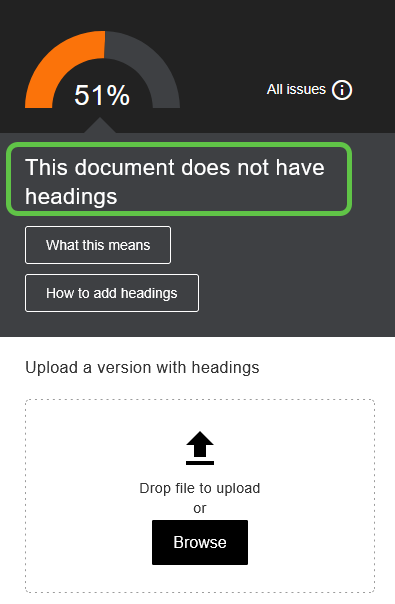 And then the only option is to re-upload a new version of the document after fixing it. The issue, in this case, is that I did not use actual headings to sequence the document, but I only used bold text. So, quick reminder, always use a proper styling so a screen reader can follow your document in its logical order. That means using this menu (in Word):