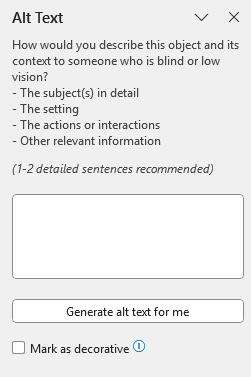 In Word, open your document, find your image and right-click on it. Select “View alt-text”, This will open a panel where you can enter your image description.